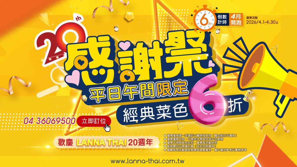 LANNA THAI 蘭那20歲週年慶!! 平日午間限定經典料理TPO15道6折回饋, 快來重溫我們的經典味道…